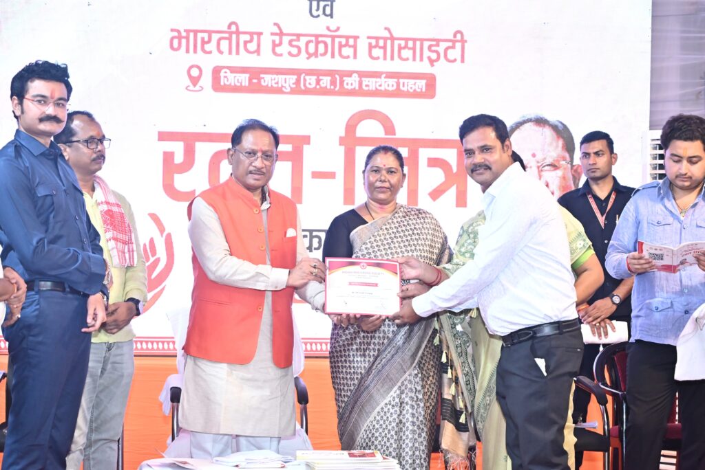 इस अवसर पर मुख्यमंत्री श्री विष्णु देव साय ने कैम्प कार्यालय बगिया में आयोजित कार्यक्रम में भारतीय रेडक्रॉस सोसायटी जशपुर के आजीवन सदस्यों को प्रमाण पत्र वितरित किए और “रक्त-मित्र” पुस्तिका का विमोचन किया। इस दौरान उन्होंने श्री नीरज शर्मा, श्री अजय कुमार कुशवाहा और श्री शिव नारायण सोनी को प्रमाण पत्र प्रदान कर उनके योगदान की सराहना की।