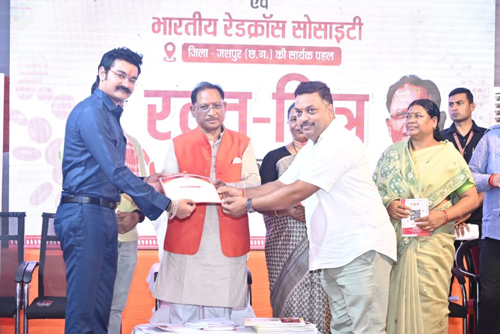 Raipur chhattisgarh VISHESH रायपुर, 25 जुलाई 2025/ मुख्यमंत्री श्री विष्णु देव साय ने कहा है कि रक्तदान एक पुनीत कार्य है, जो न केवल किसी जरूरतमंद को जीवनदान देता है, बल्कि मानवता के प्रति हमारी सेवा भावना का श्रेष्ठतम उदाहरण भी है। मुख्यमंत्री श्री साय आज जशपुर जिले के ग्राम बगिया में भारतीय रेडक्रॉस सोसायटी द्वारा आयोजित कार्यक्रम को संबोधित कर रहे थे।