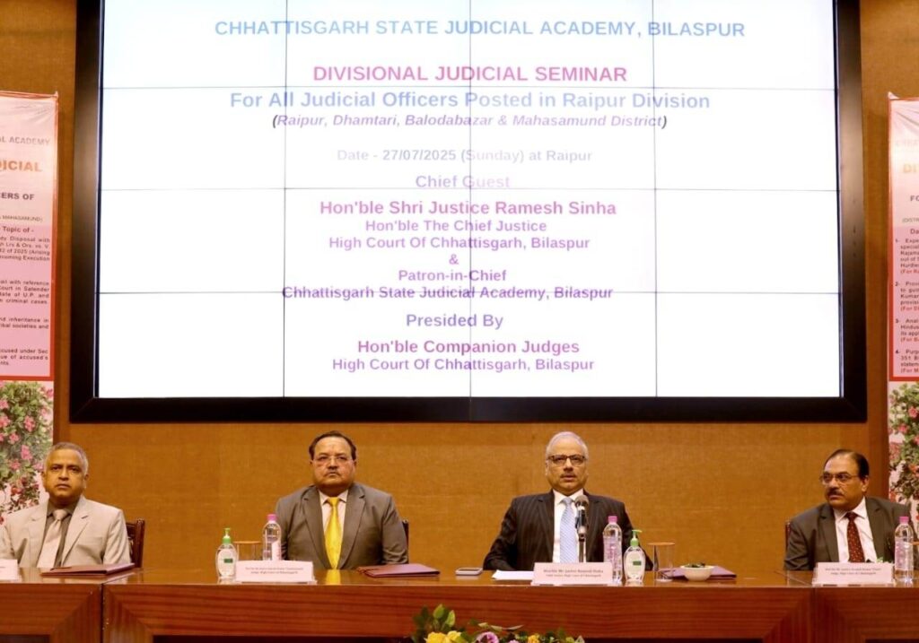 न्यायिक सेमिनार में मुख्य न्यायाधीश श्री रमेश सिन्हा ने रायपुर संभाग के न्यायिक अधिकारियों को संबोधित करते हुए कहा कि वर्तमान में न्यायपालिका से अपेक्षाएं अत्यधिक बढ़ गई हैं। जनता हमसे निष्पक्षता, गति और संवेदनशीलता की अपेक्षा रखती है। सेमिनार में चर्चा के लिए निर्धारित विषय हमारे आपराधिक और दीवानी न्यायशास्त्र के मूल स्तंभ हैं। इन क्षेत्रों में दक्षता केवल प्रक्रियात्मक अनुपालन का विषय नहीं है, बल्कि निष्पक्ष न्याय सुनिश्चित करने, व्यक्तिगत स्वतंत्रताओं की रक्षा करने और न्यायिक प्रक्रिया में सार्वजनिक विश्वास को बढ़ावा देने का एक महत्वपूर्ण पहलू है।
