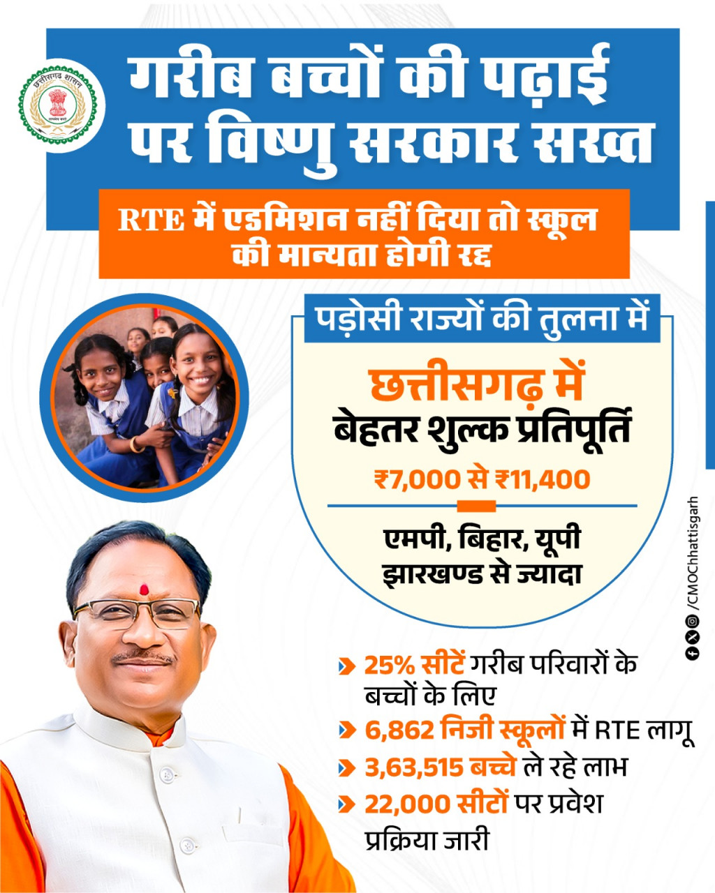 छत्तीसगढ़ में निःशुल्क एवं अनिवार्य बाल शिक्षा का अधिकार अधिनियम (RTE) 2009, अप्रैल 2010 से प्रभावी है। इसके अंतर्गत प्रदेश के गैर-अनुदान प्राप्त अशासकीय विद्यालयों की प्रारंभिक कक्षाओं में 25 प्रतिशत सीटें आरक्षित की गई हैं। इन सीटों पर आर्थिक रूप से कमजोर, दुर्बल वर्ग और वंचित समूह के बच्चों को उनके निवास क्षेत्र के भीतर प्रवेश दिलाया जाता है। मुख्यमंत्री श्री विष्णु देव साय के नेतृत्व में राज्य सरकार गरीब बच्चों की शिक्षा के प्रति पूरी तरह संवेदनशील है और सभी के लिए शिक्षा सुनिश्चित करने हेतु विशेष प्रयास किए जा रहे हैं।