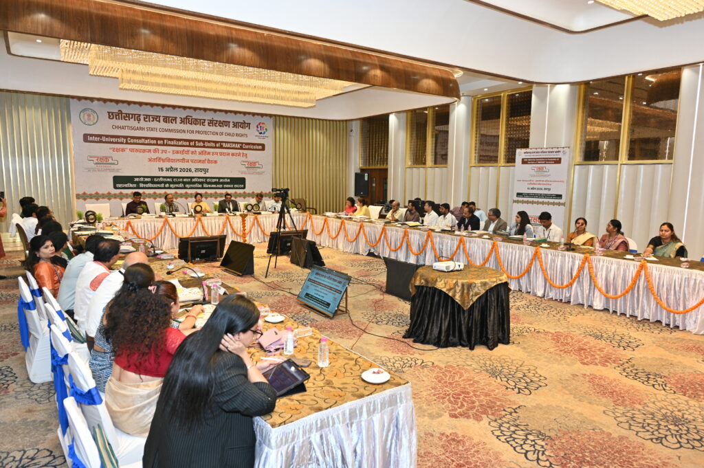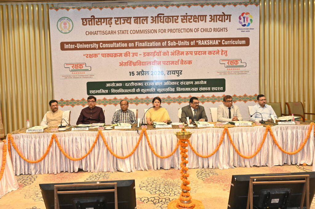 Raipur chhattisgarh VISHESH छत्तीसगढ़ राज्य बाल अधिकार संरक्षण आयोग रायपुर द्वारा बाल अधिकारों के संरक्षण के क्षेत्र में 06 विश्वविद्यालयों से एम.ओ.यू. संपादित कर एक वर्षीय पोस्ट ग्रेजुएशन डिप्लोमा पाठ्यक्रम ’’रक्षक’’ आरंभ करने हेतु कार्यवाही की गई थी । इसी कार्यवाही को आगे बढ़ाते हुए 15 अप्रैल 2026 को रायपुर में एक दिवसीय अंतर्विश्वविद्यालयीन परामर्श बैठक का आयोजन किया गया। दिन भर चिंतन मंथन करते हुए इस बैठक में ’’रक्षक’’ पाठ्यक्रम के आठ प्रश्न पत्रों की उप इकाईयों को अंतिम रूप दे दिया गया। इस परामर्श बैठक में आयोग की अध्यक्ष डॉ. वर्णिका शर्मा, सचिव श्री प्रतीक खरे, प्रो. सच्चिदानंद शुक्ल कुलपति पं. रविशंकर शुक्ल विश्वविद्यालय, प्रो. मनोज दयाल कुलपति कुशाभाऊ ठाकरे पत्रकारिता एवं जनसंचार विश्वविद्यालय, डॉ. पीयूष कांत पाण्डेय कुलपति एमिटी युनिवर्सिटी, डॉ. टी. रामाराव कुलपति आंजनेय विश्वविद्यालय, डॉ. संदीप श्रीवास्तव कुलपति श्री शंकराचार्य प्रोफेशनल विश्वविद्यालय, श्री सुनील कुमार शर्मा कुलसचिव कुशाभाऊ ठाकरे पत्रकारिता एवं जनसंचार विश्वविद्यालय, श्री प्रवीण अग्रवाल उप कुलसचिव संत गहिरा गुरू विश्वविद्यालय एवं श्री समय नारायण उपाध्याय संत गहिरा गुरू विश्वविद्यालय उपस्थित थे । इनके साथ ही इन विश्वविद्यालयों के 50 से अधिक विभागाध्यक्ष व सहायक प्राध्यापक उपस्थित थे ।