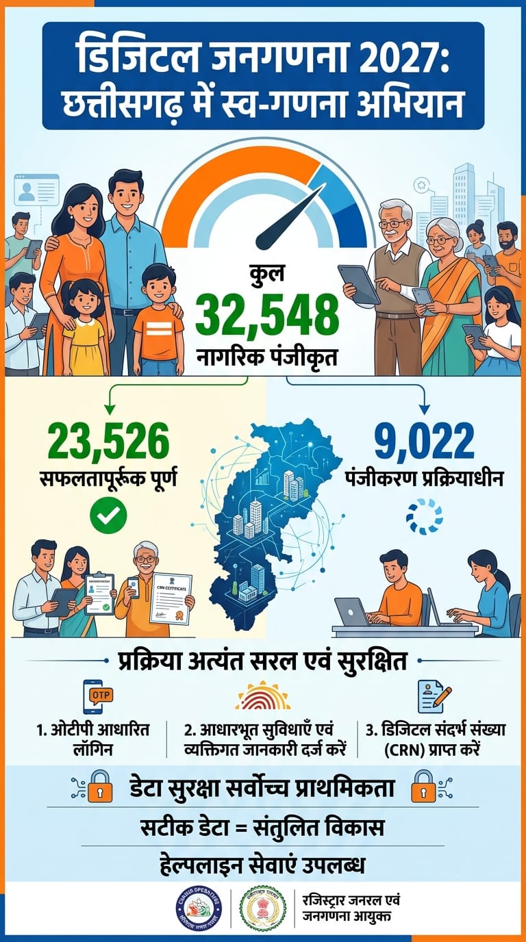 छत्तीसगढ़ में डिजिटल जनगणना 2027 के तहत संचालित स्व-गणना (Self Enumeration) अभियान में नागरिकों की भागीदारी तेज़ी से बढ़ रही है। जनगणना संचालन निदेशालय के नवीनतम आंकड़ों के अनुसार, प्रदेश में अब तक कुल 32,548 नागरिक पोर्टल पर पंजीकृत हो चुके हैं। इनमें से 23,526 नागरिकों ने अपनी गणना की प्रक्रिया सफलतापूर्वक पूरी कर ली है, जबकि 9,022 नागरिक वर्तमान में पंजीकरण कराकर डेटा प्रविष्टि की प्रक्रिया में संलग्न हैं।