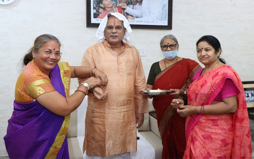 Raipur chhattisgarh VISHESH :रायपुर, मुख्यमंत्री भूपेश बघेल को सोमवार को उनके निवास कार्यालय में राज्यसभा सांसद छाया वर्मा, छत्तीसगढ़ राज्य महिला आयोग की अध्यक्ष डॉ. किरणमयी नायक और पूर्व सांसद करुणा शुक्ला ने राखी बांधी। उन्होंने मुख्यमंत्री के दीघार्यु, स्वस्थ और यशस्वी जीवन की कामना की। मुख्यमंत्री बघेल ने भी उन्हें रक्षाबंधन की शुभकामनाएं दी। उन्होंने परम्परा अनुरूप भेंट स्वरूप साड़ी और उपहार दिए