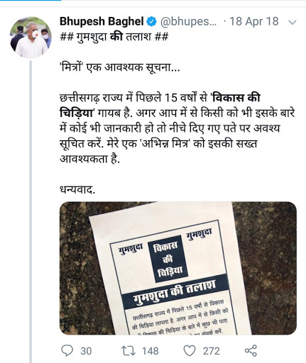दरअसल, मुख्यमंत्री भूपेश बघेल ने विपक्ष में रहते हुए अप्रैल 2018 में एक ट्वीट किया था। इसमें उन्होंने तत्कालीन सरकार को विकास के दावों को लेकर निशाना बनाया था। तब प्रदेश कांग्रेस अध्यक्ष बघेल ने लिखा था कि छत्तीसगढ़ राज्य में पिछले 15 सालों से विकास की चिड़िया गायब है। अगर आप में से किसी को भी इसके बारे में कोई जानकारी हो तो नीचे दिए गए पते पर अवश्य सूचित करें। मेरे एक अभिन्न मित्र को इसकी सख्त आवश्यकता है।