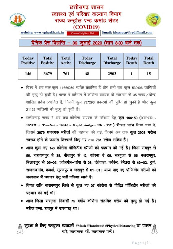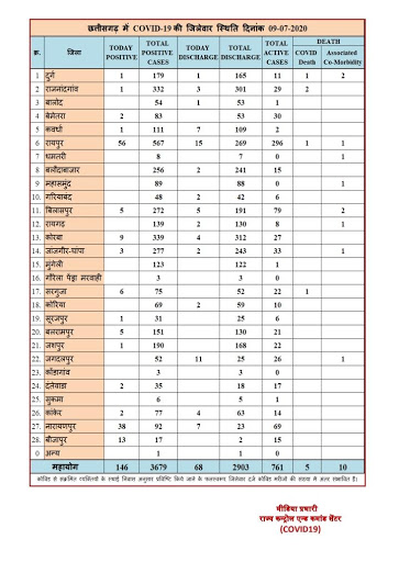 RAIPUR chhattisgarh VISHESH :आज छत्तीसगढ़ में कुल 146 कोरोना के नए मामले पाए गए हैं। अकेले राजधानी रायपुर से 56 मरीजों की पुष्टि हुई है , राज्य में अब कोरोना के कुल एक्टिव केसो की संख्या 761 है तो वही आज 68 मरीज स्वस्थ होकर घर जा चुके हैं। अब तक छत्तीसगढ़ में कुल 3679 मरीज कोरोना से संक्रमित पाए गए हैं वही राज्य में 2903 मरी अब तक स्वस्थ हो चुके हैं। कोरोना से मौत के मामले में छत्तीसगढ़ में अब तक 15 लोगों की मृत्यु हो चुकी है।