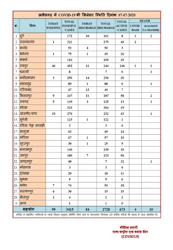 आज पॉजिटिव पाए गए मरीजों में रायपुर से 46, जांजगीर चांपा से 19, बिलासपुर से 9, कांकेर से 7, नारायणपुर से 6, रायगढ़ से 5, बलौदा बाजार से 3, बीजापुर से 2, राजनांदगांव व बेमेतरा से एक-एक मरीज पाए गए हैं। देखिए आज का मेडिकल बुलेटिन