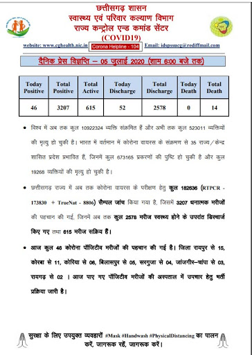 स्वास्थ्य विभाग ने शाम 6.00 बजे के मेडिकल बुलेटिन में यह जानकारी देते हुए बताया कि आज पाए गए 46 कोरोना संक्रमित मरीजों में से जिला रायपुर से 15, , कोरबा से 11, कोरिया से 6, बिलासपुर से 5, सरगुजा से 4, जांजगीर-चांपा से 3 और रायगढ़ से 2 मरीज शामिल हैं।