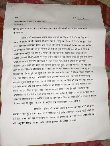 उक्त विषय में आज विभागीय मंत्री टी. एस. बाबा जी को भी पत्र दिया गया है , विभाग द्वारा बोला गया है की लॉक डाउन के इस विषम परिस्थिति में M M I द्वारा ये सब आमानवीय है , एवं हॉस्पिटल द्वारा प्रदेश सरकार एवं सुप्रीम कोर्ट के फासले को दर किनारे करते हुए जो कृत किया है उसका उसे हिसाब देना होगा ,मंत्री महोदय से निवेदन है की पेशेंट का जायज पैसा ले कर बाकि का पैसा पेशेंट को रिफंड कराया जाये , एवं ऐसा हॉस्पिटल जिसे प्रसासन के नियम कानूनों की चिंता न हो उसका लाइसंस रद्द किया जाये , उक्त लेख केंद्रीय प्रशासन को भी भेजा जायेगा , पेशेंट द्वारा आज राज्य के स्वास्थय मंत्री जी को पत्र दिया गया करवाई हेतु