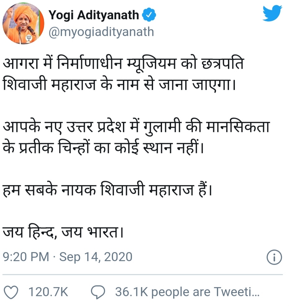 आगरा के फतेहाबाद मार्ग पर लगभग 190 करोड़ रुपये की लागत से प्रदेश का पहला प्री-कास्ट म्यूजियम लगभग तैयार है। इसका नाम अब मुगल म्यूजियम से बदलकर छत्रपति शिवाजी के नाम पर रखा जाएगा। इसमें ताजमहल और आगरा के इतिहास साथ छत्रपति शिवाजी का इतिहास दर्ज होगा। आगरा में निर्माणाधीन म्यूजियम को छत्रपति शिवाजी महाराज के नाम से जाना जाएगा ।आपके नए उत्तर प्रदेश में गुलामी की मानसिकता के प्रतीक चिन्हों का कोई स्थान नहीं।मुख्यमंत्री योगी ने सोमवार शाम छह बजे वीडियो कॉन्फ्रेसिंग से समीक्षा की। कोरोना वायरस के कारण कलक्ट्रेट स्थित एनआईसी में अधिकारियों और जनप्रतिनिधियों को अलग-अलग कक्षों में बैठाया गया। मुख्यमंत्री ने 10 से 50 करोड़ की योजनाओं को जल्द पूरा करने के निर्देश दिए।