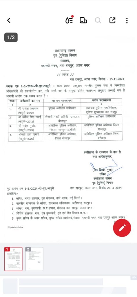Raipur chhattisgarh VISHESH राज्य शासन एतद्धारा भारतीय पुलिस सेवा के निम्नांकित अधिकारियों को स्थानांतरित कर, उन्हे उनके नाम के सम्मुख दर्शित कालम 4 अनुसार अस्थाई रूप से आगामी आदेश तक पदस्थ करता है: