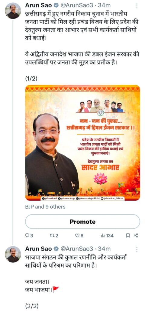 नगरीय निकाय चुनाव में भारतीय जनता पार्टी को मिल रही प्रचंड विजय पर माननीय उप मुख्यमंत्री श्री अरुण साव जी ने प्रदेश की देवतुल्य जनता का आभार जताकर, कार्यकर्ता साथियों को बधाई दी