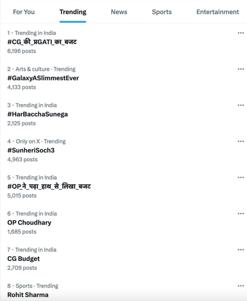 Raipur chhattisgarh VISHESH रायपुर, 3 मार्च, 2025/छत्तीसगढ़ का बजट आज एक्स पर ट्रेंड में पहले स्थान पर रहा। पांच बजे तक इस संबंध में 6 हजार 196 पोस्ट किये जा चुके थे। मुख्यमंत्री श्री विष्णु देव साय सरकार ने इस बजट का थीम ज्ञान के लिए गति रखा था। मुख्यमंत्री श्री विष्णु देव साय सरकार के कैबिनेट में वित्त मंत्री श्री ओपी चौधरी ने यह बजट आज विधानसभा में प्रस्तुत किया। पिछले बजट में ज्ञान पर जोर दिया गया था जिसका तात्पर्य यह था कि यह बजट गरीब, युवा, अन्नदाता और नारीशक्ति पर आधारित है। यह प्रधानमंत्री श्री नरेंद्र मोदी द्वारा इन वर्गों पर फोकस कर बनाई जा रही कल्याणकारी नीतियों पर आधारित था। इस बार ज्ञान के लिए गति थीम रखा गया। यहां गति से तात्पर्य था। जी अर्थात गुड गवर्नेंस, ए अर्थात एक्सीलरेटिंग इंफ्रास्ट्रक्चर, टी अर्थात टेक्नालाजी एवं आई अर्थात इंडस्ट्रियल ग्रोथ था। इसी पर आधारित #CG_ की _ प्रGATI_ का _ बजट ने आज एक्स पर ट्रेंड किया। इस बजट में विशेष रूप से डिजिटल टेक्नालाजी पर अत्याधिक जोर होने की वजह से युवाओं को इसने काफी प्रभावित किया। इसी के साथ #CG_बजट टापिक ने भी एक्स पर काफी ट्रेंड किया।