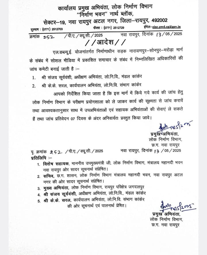 बता दें, बीते दिनों उप मुख्यमंत्री साव की सजगता और विभागीय जांच के आदेश के बाद ही सड़क भ्रष्टाचार में लिप्त सुरेश चंद्राकर तथाकथित कांग्रेस कार्यकर्ता के भ्रष्टाचार का भंडाफोड़ हुआ था, पी डब्लू डी ने ठेकेदार सुरेश चंद्राकर पर कड़ी कार्रवाई करते हुए उसका लाइसेंस रद्द कर दिया था साथ ही अधिकारियों एवं ठेकेदार पर पुलिसिया कार्रवाई भी करवाई थी।उप मुख्यमंत्री साव लापरवाही और भ्रष्टाचार के खिलाफ लगातार आक्रामक मूड में दिखाई दे रहे हैं।