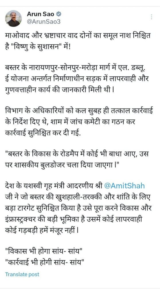 देश के यशस्वी गृह मंत्री आदरणीय श्री @AmitShah जी ने जो बस्तर की खुशहाली-तरक्की और शांति के लिए बड़ा टारगेट सुनिश्चित किया है उसे पूरा करने विकास और इंफ्रास्ट्रक्चर की बड़ी भूमिका है उसमें कोई लापरवाही कोई गड़बड़ी हमें मंजूर नहीं l